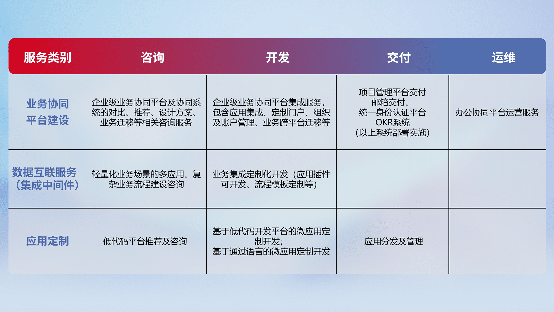 针对钉钉、、企微、、IDaas等平台级产品提供产品的规划、、、方案、、交付、、、定制化开发等服务,,,实现如统一协同办公、、、、智能客户服务、、混合会议管理、、、、智能数据查询、、、、等业务场景,,实现数字化转型。。。。