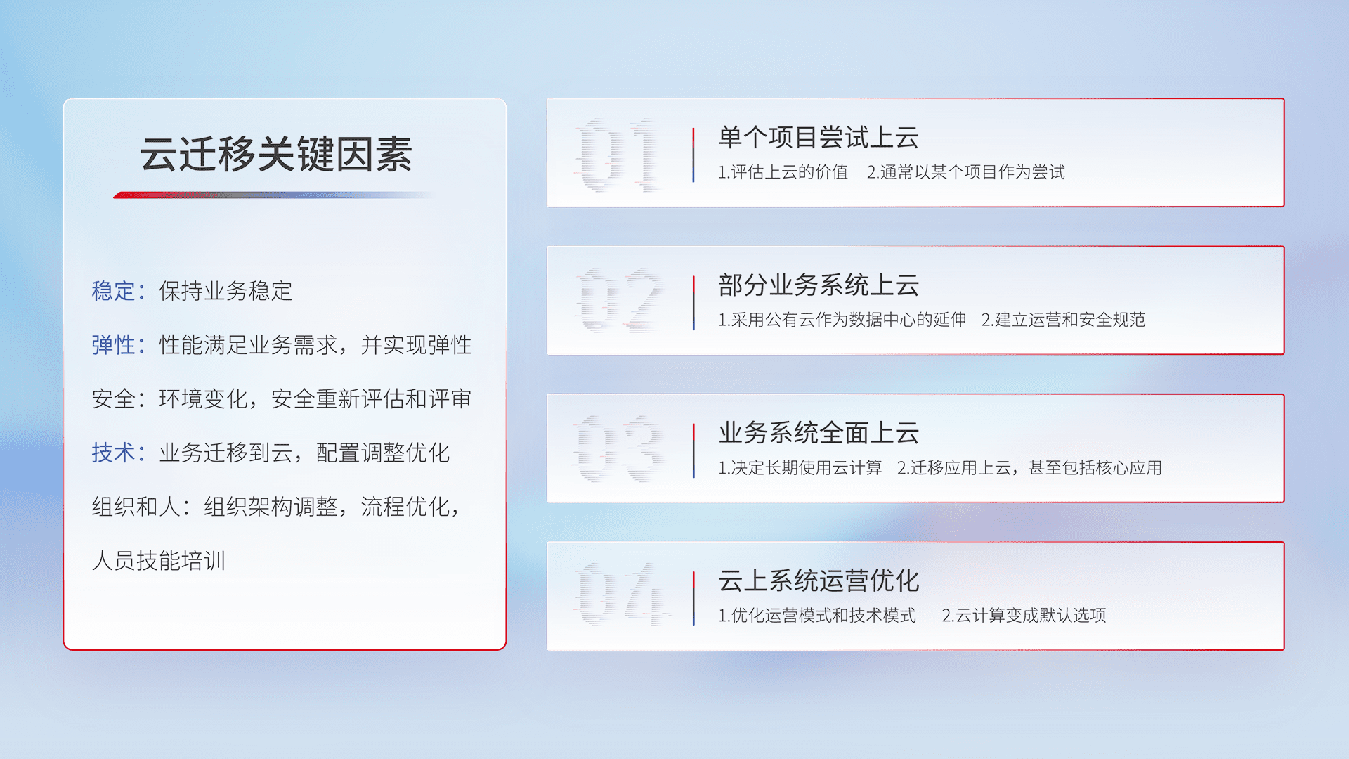 结合实际业务,,,,从规划设计、、、、云平台选型、、、、云原生改造、、数据迁移、、、、集成交付,,,,迁移全过程为客户识别最佳上云路径,,做好风险识别管理,,设计网络架构、、身份权限、、安全审计合规、、操作审计、、、日志审计、、监控告警策略、、、多站点容灾设计等,,对云上基础设施进行整体规划,,,,提升IT治理水平,,以满足弹性、、高可用、、高性能的需求。。。。