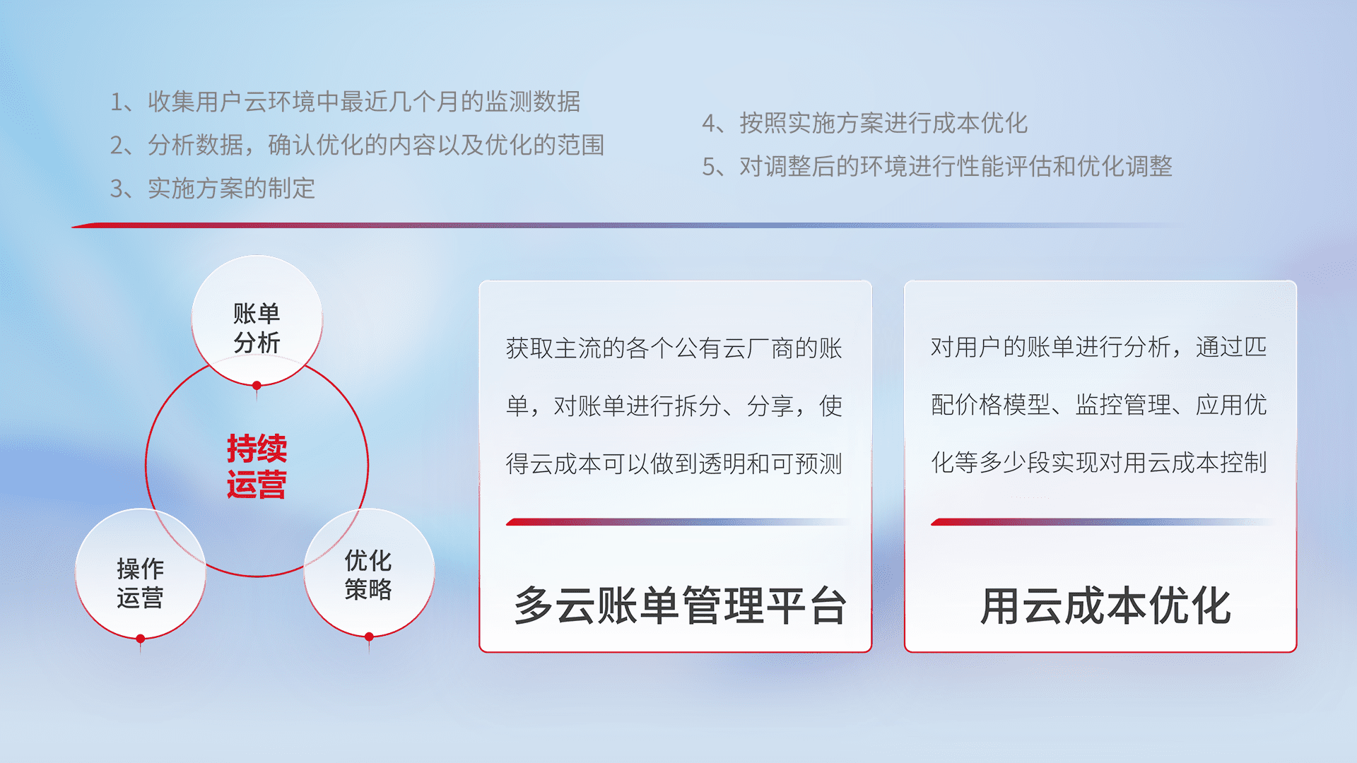 通过多云纳管,,,以统一的资源数据模型把客户的云资源进行抽象和封装,,,进而实现对多云资源的统一操作,,保障云资源管理的可靠性、、稳定性与可用性。。。量身定制化运维内容,,,,配置、、、、开发运维、、、补丁管理、、备份、、监控、、、认证和访问管理、、、审计和日常巡检等,,,,保障在用云过程中的可靠度,,,,稳定度以及高可用率。。